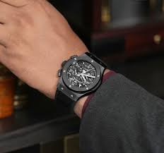 A modern men’s chronograph wristwatch featuring a bold skeleton dial, durable stainless-steel case, and comfortable black rubber strap. Designed for precision and style, it’s perfect for both formal and casual wear.