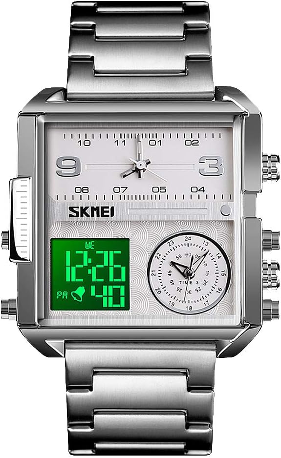 SKMEI Men’s Digital & Analog Wristwatch – Stylish square stainless steel design featuring dual display (analog + digital), LED backlight, stopwatch, alarm, calendar, and 30M water resistance. Perfect blend of modern tech and classic style.